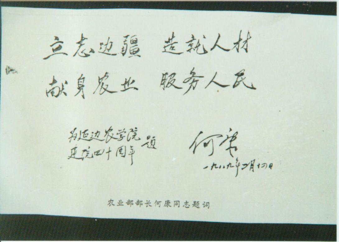 时任农业部部长何康同志为延边农学院题词(1989年)