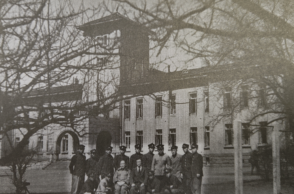 龙井医科大学校长卢基舜(前排左三)与学生在校舍前(1946年)